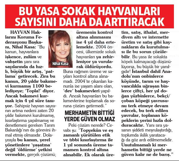 20 yıldır bakımevi kurmayan, kısırlaştırma yapmayan, kanun tanımaz belediyelerin görev ihmalinin bedelinin masum hayvanlara ödettiriliyor. Bu kanunun ölüm getiren maddelerinin de ötesinde bakanlıklarca yayımlanan genelgeler hayvanların idam fermanı oldu.