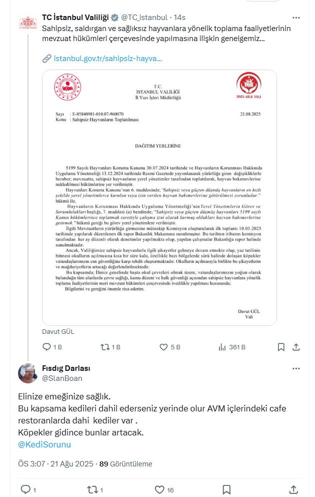 KEDİ ve KÖPEKLER ÖLDÜRÜLSÜN diyen kanlı güruh ve trolleri de sn Valiyi takdir ve tebrik ediyor!