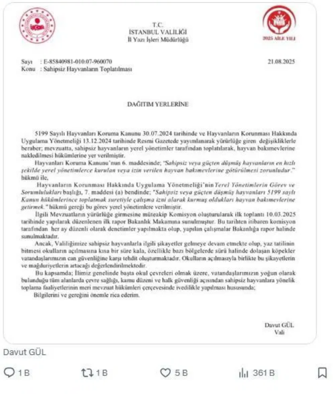 İstanbul Valiliği, “Sahipsiz hayvanlar güvenlik sorunu!” diyerek, yasada olmadığı halde KEDİLERİN de TOPLANMASINI yasaya aykırı olarak kurnazca araya sıkıştırıp talimatlandırdı!
