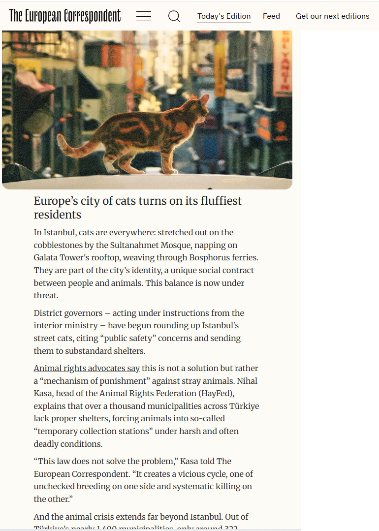 İstanbul’da kediler her yerdedir: Sultanahmet Camii’nin taş döşeli avlusunda uzanmış, Galata Kulesi’nin tepesinde uyuklayan, Boğaz vapurlarının arasında süzülürken... Onlar bu şehrin kimliğinin bir parçasıdır; insanlar ve hayvanlar arasında kurulmuş benzersiz bir toplumsal sözleşmenin simgesidir. Ancak bu denge artık tehdit altında.İçişleri Bakanlığı’nın talimatları doğrultusunda, “kamu güvenliği” gerekçesiyle İstanbul’un sokak kedileri de toplanmaya başladı.Hayvan hakları savunucuları bunun bir çözüm değil, sokak hayvanlarına karşı “cezalandırma mekanizması” olduğunu belirtiyor.