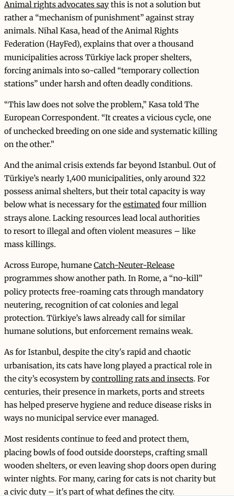 Avrupa’da ise insancıl Yakalama-Kısırlaştırma-Serbest Bırakma (CNR) programları farklı bir yol gösteriyor. Roma’da uygulanan “öldürmeme” politikası, serbest dolaşan kedilerin zorunlu kısırlaştırılmasını, kedi kolonilerinin yasal olarak tanınmasını ve korunmasını sağlıyor. Türkiye yasaları da benzer insancıl çözümler öngörüyor, ancak uygulama hâlâ zayıf.İstanbul’da ise hızlı ve kaotik kentleşmeye rağmen kediler uzun süredir şehrin ekosisteminde önemli bir rol oynuyor: fareleri ve böcekleri kontrol ederek hijyenin korunmasına, hastalıkların önlenmesine katkı sağlıyorlar – üstelik bunu hiçbir belediye hizmetinin başaramadığı ölçüde yapıyorlar.Kent sakinlerinin çoğu kedileri beslemeye ve korumaya devam ediyor: kapı önlerine mama kapları koyuyor, küçük ahşap barınaklar yapıyor, hatta kış gecelerinde dükkânlarının kapılarını açık bırakıyorlar. Birçok kişi için kedilere bakmak bir hayır işi değil, bir yurttaşlık görevi – çünkü bu, İstanbul’u İstanbul yapan şeylerden biri.